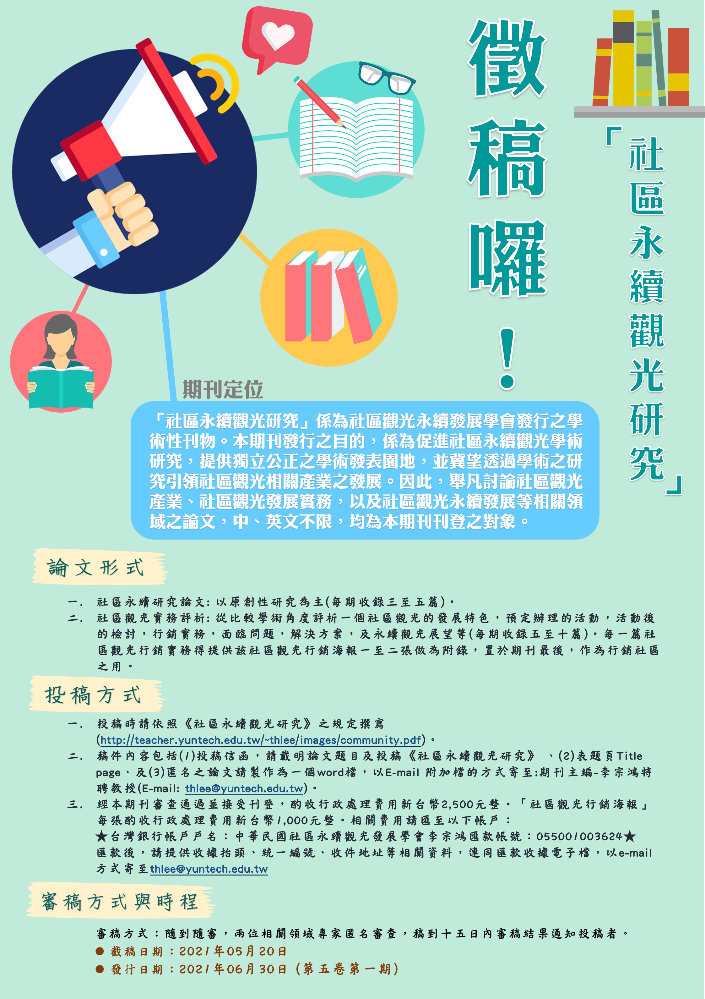 「社區永續觀光研究」第五卷第一期徵稿中 徵稿海報 投稿規定